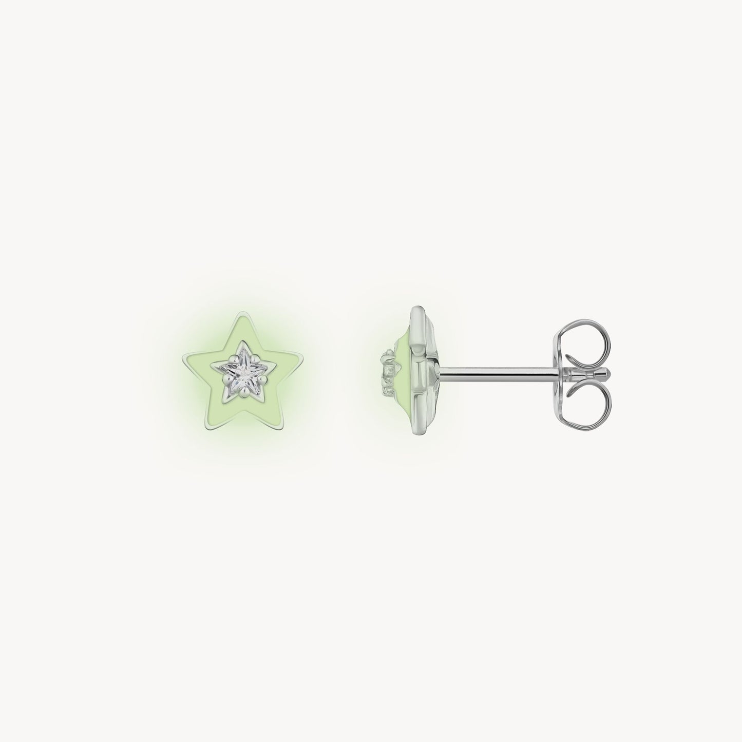 Crafted from high-quality 925 Sterling silver, these stud earrings take the shape of three-dimensional stars with a central white zirconia stone featuring a star cut. The hand-applied luminescent white cold enamel adds a captivating glow, especially in the dark.